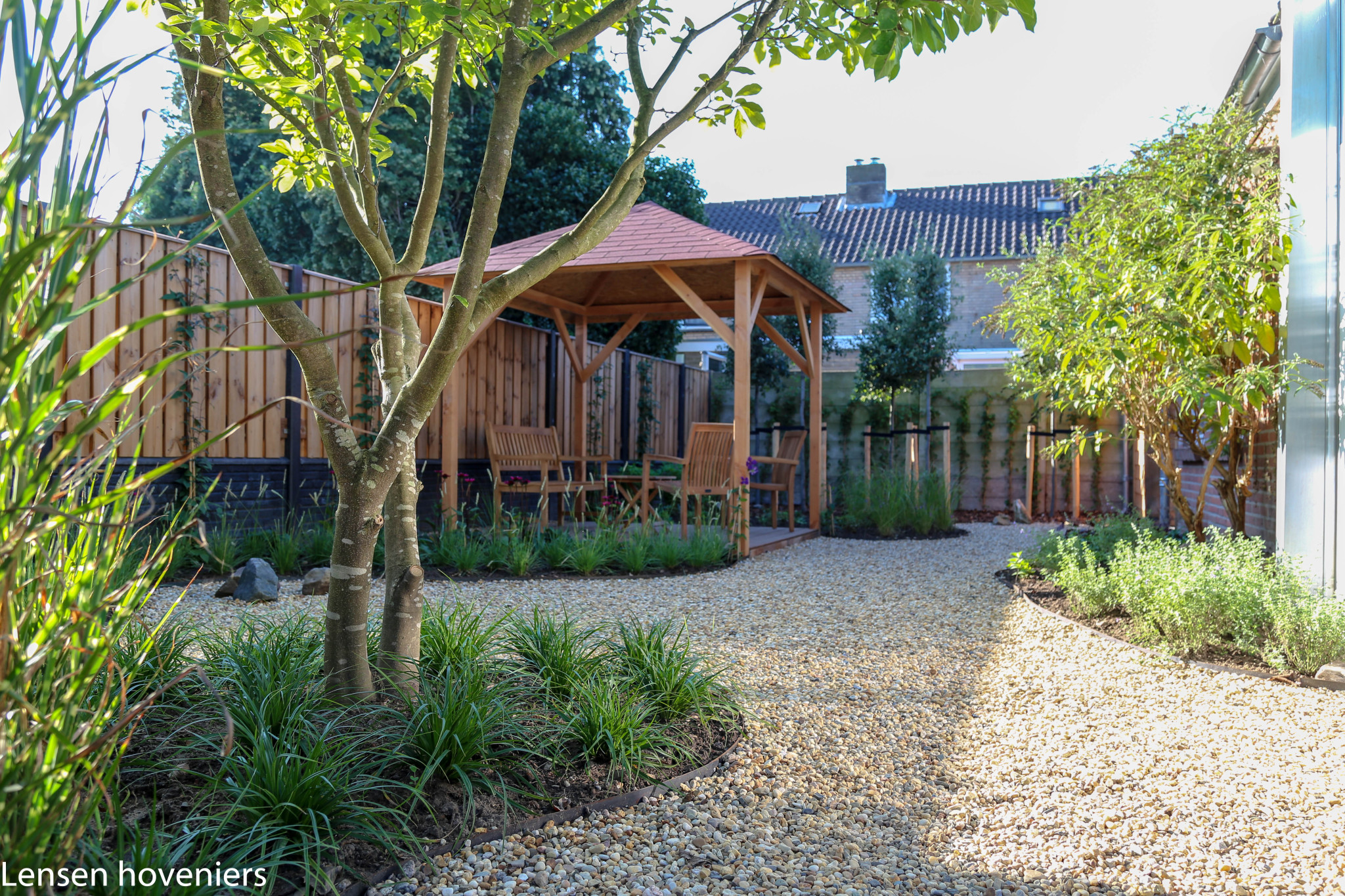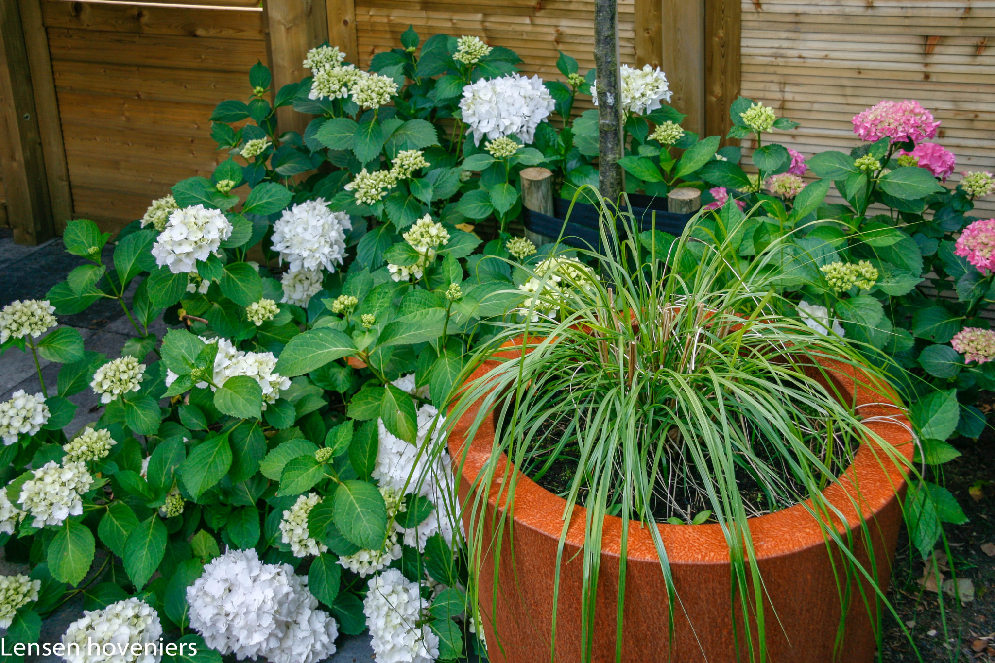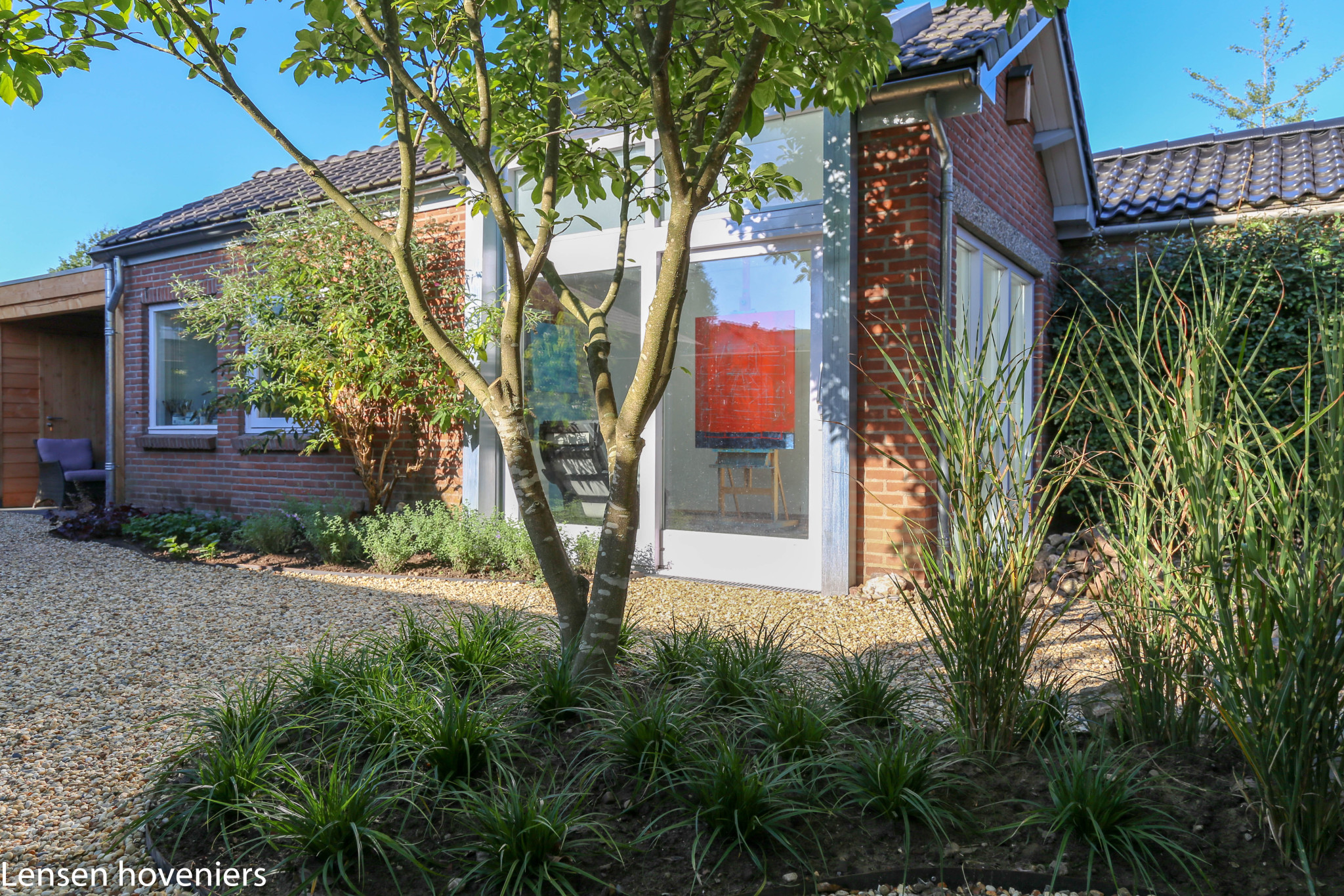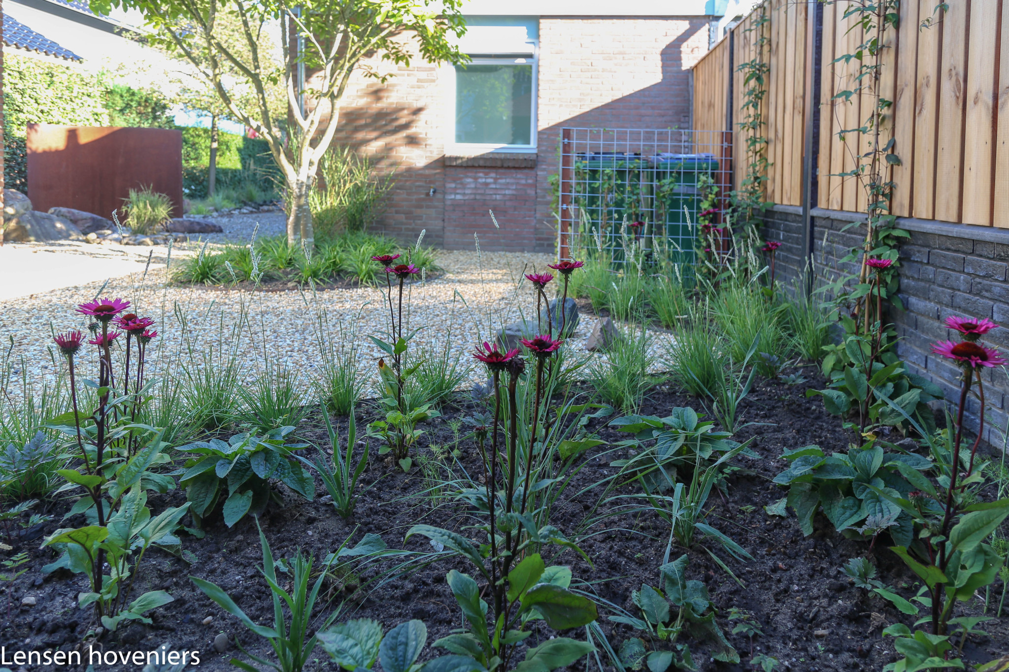 Op de foto’s is te zien hoe Lensen hoveniers dit aangepakt heeft. Naast een tuinontwerp is voor deze tuin ook een beplantingsplan gemaakt. Er is gebruik gemaakt van diverse soorten siergrassen en andere beplanting, die in verschillende seizoenen tot bloei komen. Zo is er altijd iets in bloei in de tuin. De beplanting is aangeplant in borders met meanderende vormen, die de tuin een natuurlijke uitstraling geven. Ook het grind en boomschors dragen hieraan bij.
