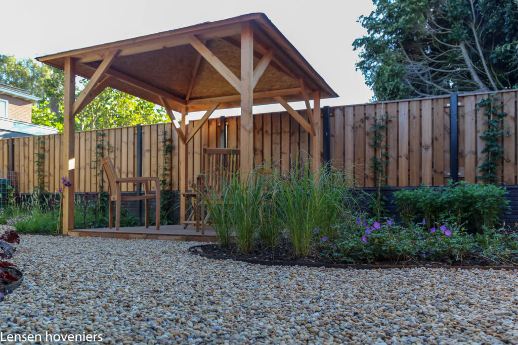 De Douglashouten overkapping heeft een speels piramidedak. Als vloer bij de overkapping is voor een hardhouten vlonder gekozen. Het mooie van deze vlonder is dat de hardhouten planken met het B-fix systeem zónder schroeven op gelamineerde hardhouten liggers wordt bevestigd. Hierdoor heeft de vloer een vlakke bovenzijde met nauwelijks zichtbare schroeven. Een heerlijk plekje om in de schaduw te kunnen genieten van alles wat groeit en bloeit om je heen. Om andere voorbeelden van een tuinoverkapping bekijken? Klik hier. Wist je dat op Instagram en Pinterest ook veel tuinvoorbeelden zijn te bewonderen.