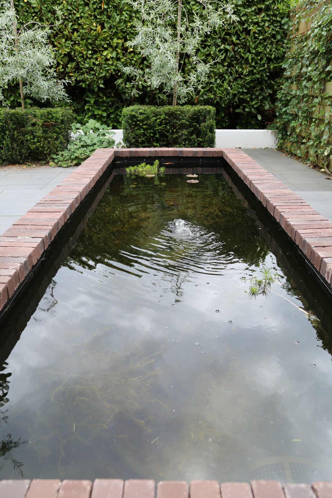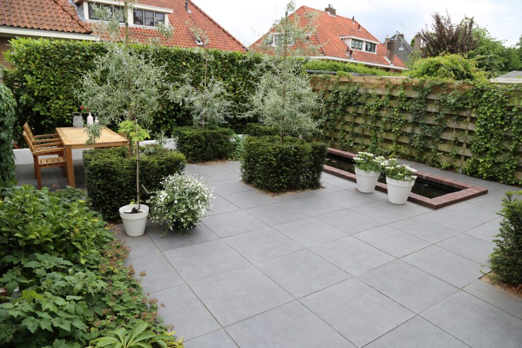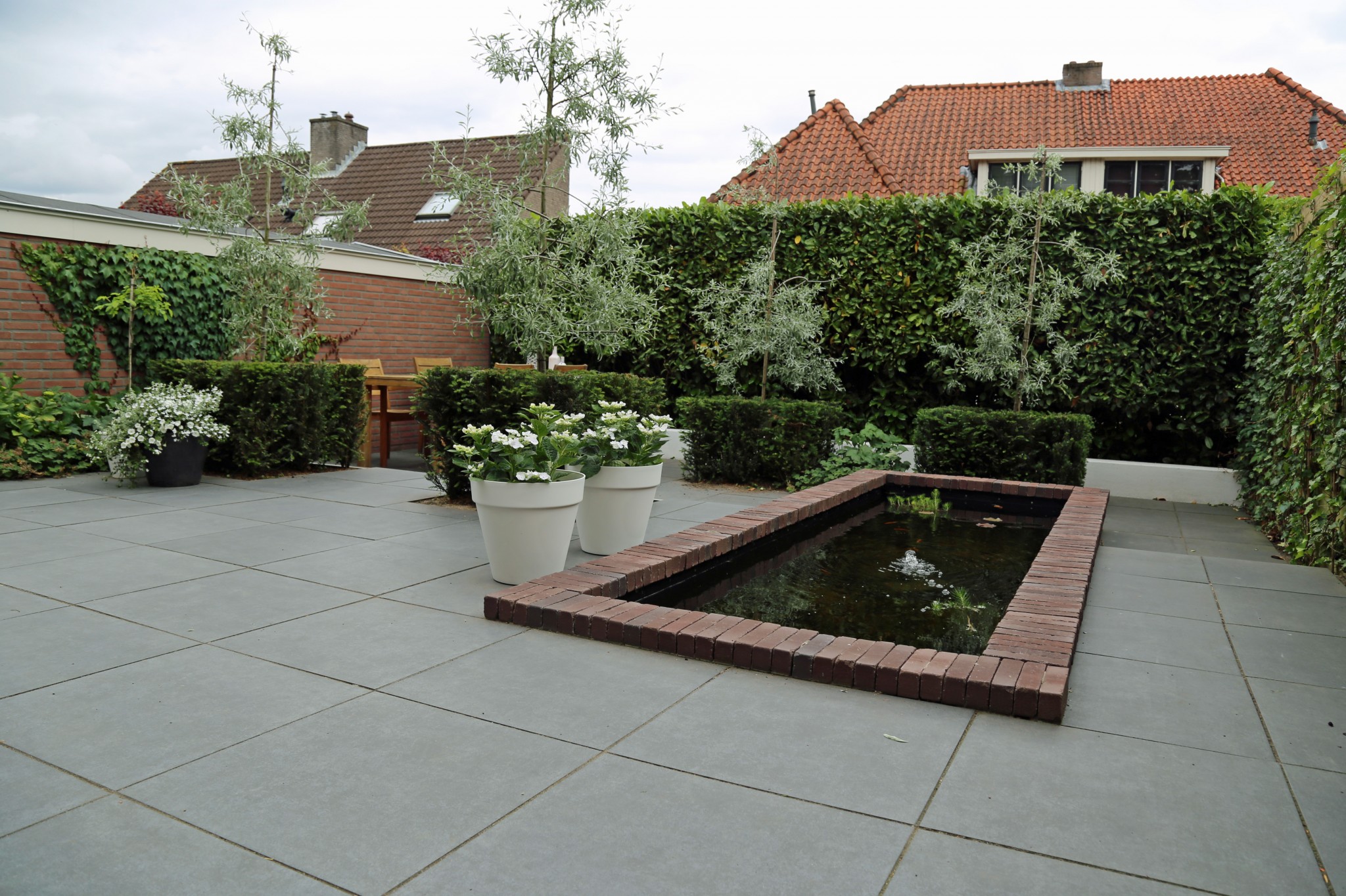 U ziet een moderne achtertuin met een strakke vijver, met gemetselde vijverrand. In de strakke vijver zitten zuurstofplanten en een waterlelie. Het terras is aangelegd met de Belgium Bumpy Black tegel. Deze tegel geeft een mooi strak eindresultaat. Voor de beplanting is gebruik gemaakt van taxus die strak in blokken zijn gesnoeid. Een leuk detail zijn de aangeplante Pyrus Pendula, de grijze bladeren aan de neerhangende takken komen mooi tot hun recht en geven veel sfeer aan de achtertuin. de Pyrus Pendula bloeit in april-mei.