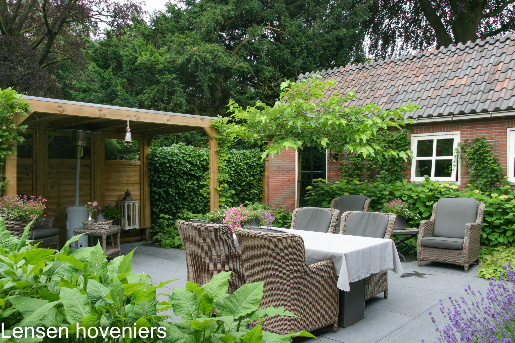 De bewoners van deze achtertuin in Renkum hebben een tuin aan laten leggen die een verlengstuk van hun huis is geworden. Een achtertuin met veel zit mogelijkheden en niet te veel tuinonderhoud. Na de tuinaanleg is er d.m.v. beplanting, tuinmeubels en tuinaccessoires veel sfeer ontstaan. Door de tuin overkapping (bushalte noemen de bewoners het) kan men ook als er een bui valt rustig buiten blijven zitten. U ziet meer informatie over tuinhuisjes en overkappingen op de pagina hier over.