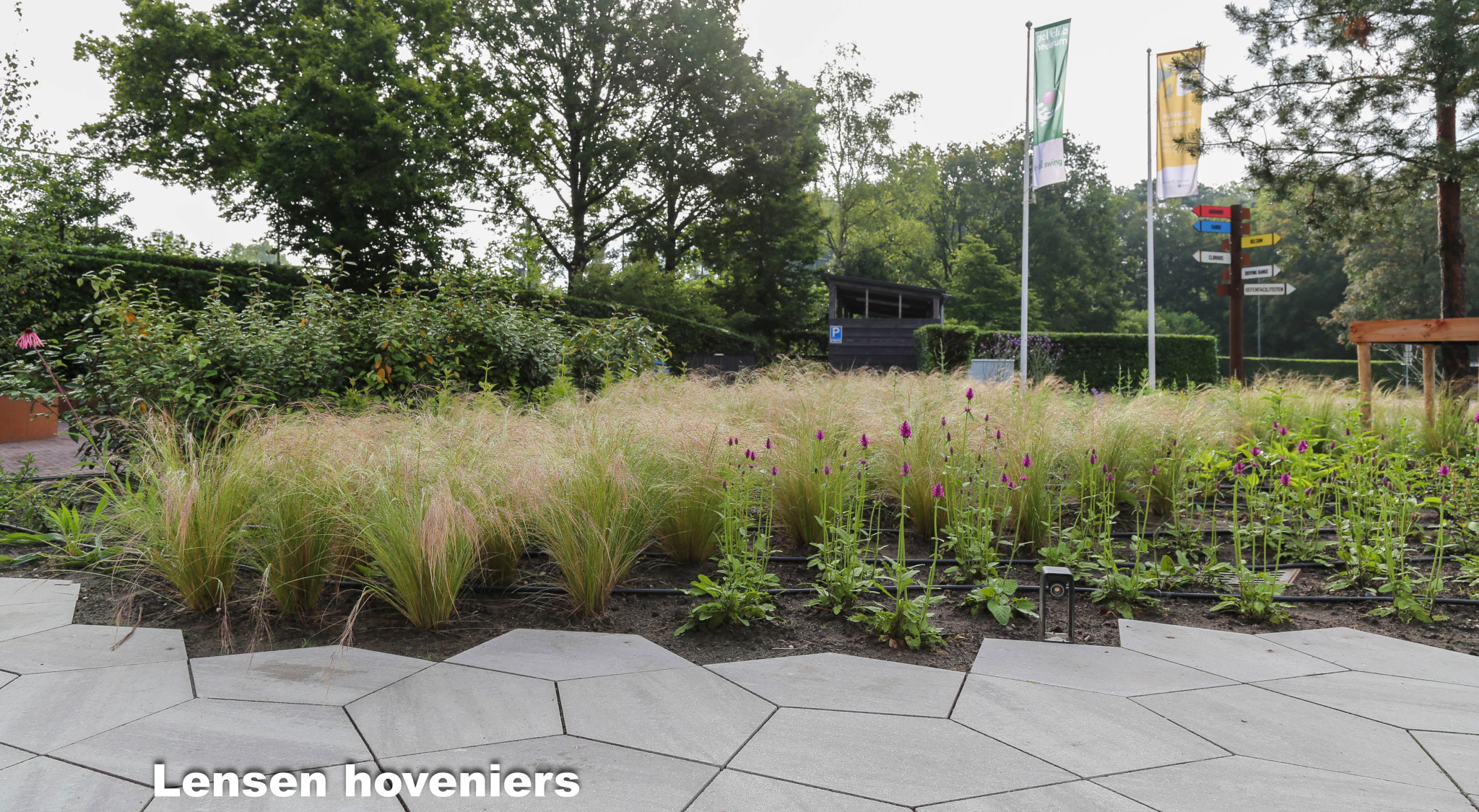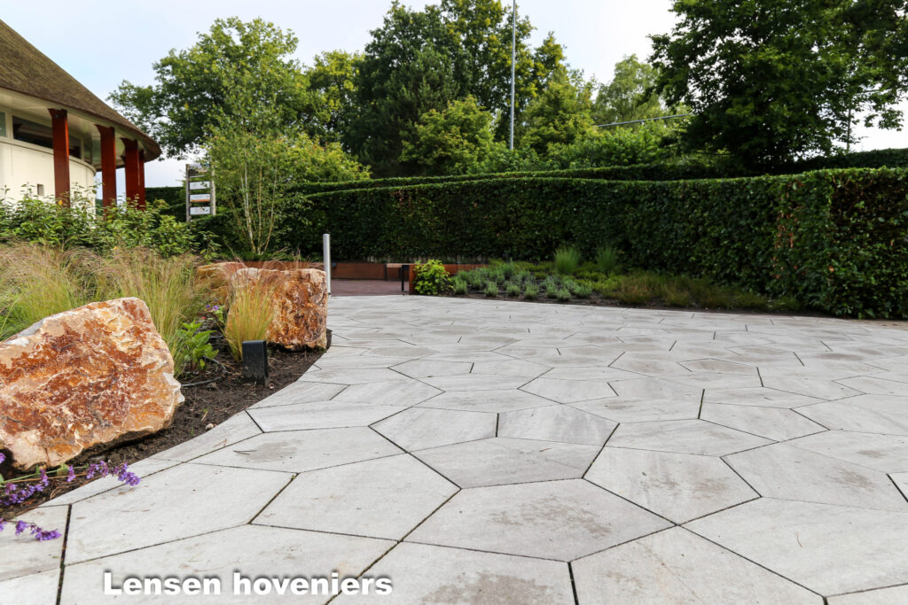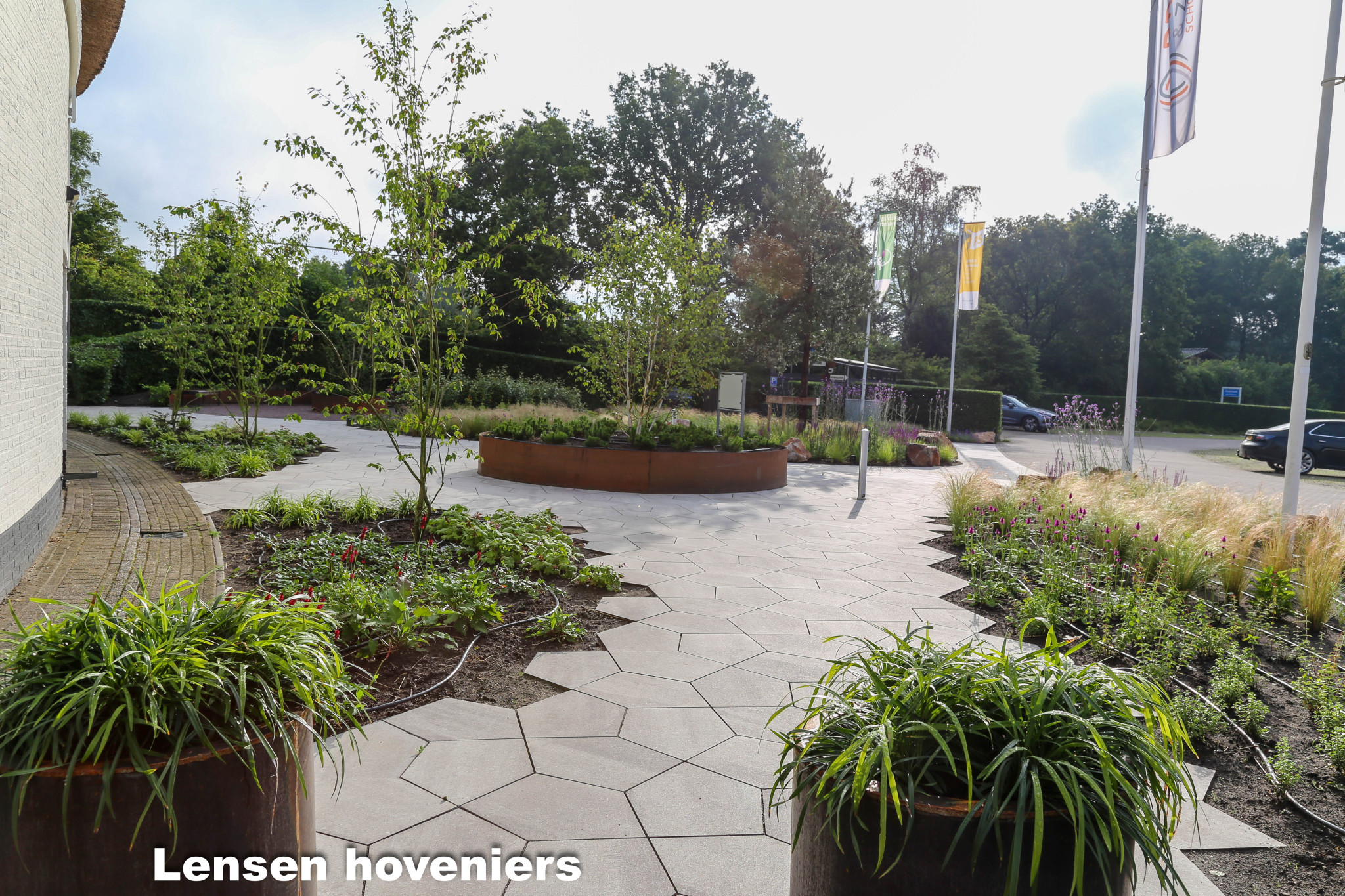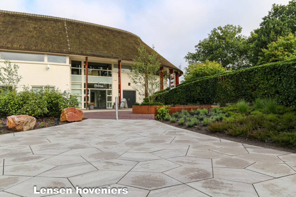 Begin 2024 is begonnen met de tuinaanleg van de entree, de oude klinkers zijn er allemaal uit gehaald. Er heeft grondwerk plaatsgevonden en er is nieuwe bestrating gerealiseerd door het leggen van 5 hoekige tegels (Geostretto Alivo). Deze tegel heeft een speelse uitstraling en de kleur van de tegel past perfect bij het dak van het entreegebouw. Heel mooi is de prairiebeplanting die is aangeplant in combinatie met Cortenstaal, dit is duurzaam en klimaatbestendig. De beplanting moet nu natuurlijk nog groeien maar we verheugen ons erop als alles volgroeid is. Prairiebeplanting vereist minder water en Cortenstaal staat bekend om zijn duurzaamheid en weerbestendigheid. Bij de ingang is een pleintje gecreëerd met bankjes waar bezoekers kunnen wachten en elkaar kunnen ontmoeten voordat ze gaan golfen. Dit draagt bij aan een gastvrije en sociale omgeving voor bezoekers.