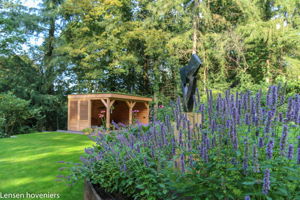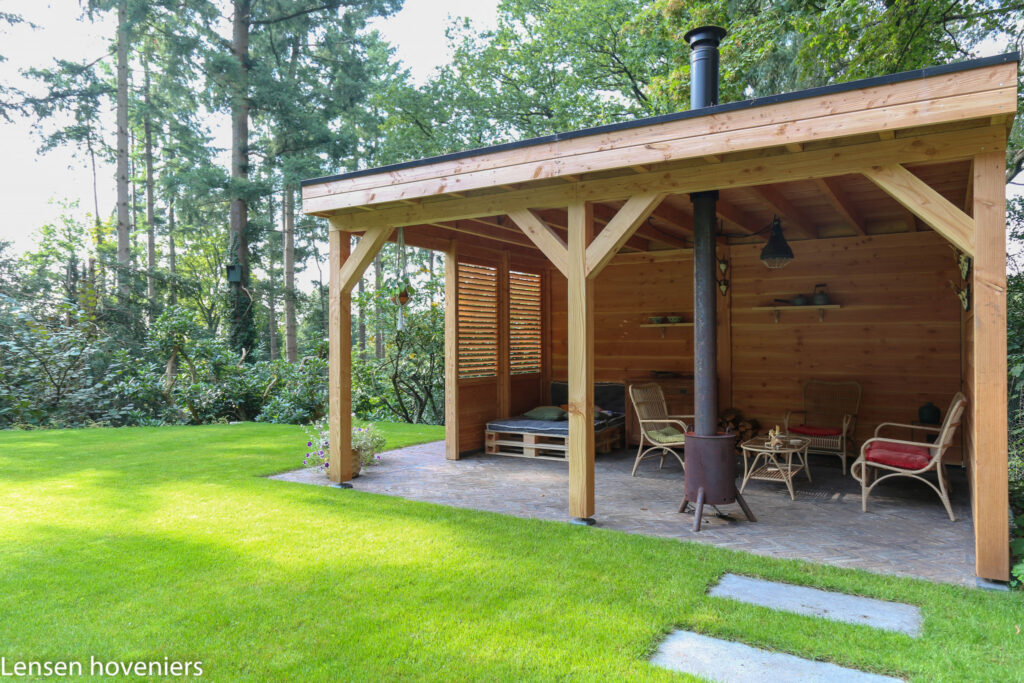 In het stuk bostuin zijn paden van houtsnippers gerealiseerd. Als je achter in de bostuin staat kijk je heel mooi op het huis en de tuin. In de geplaatste tuinoverkapping beleef je vakantie in eigen tuin. Je kunt er heerlijk rond het houtvuur zitten mijmeren en tot rust komen met je blik op de tuin. Wilt u veschillende overkappingen bekijken, klik hier, inspiratie via Instagram, klik hier.