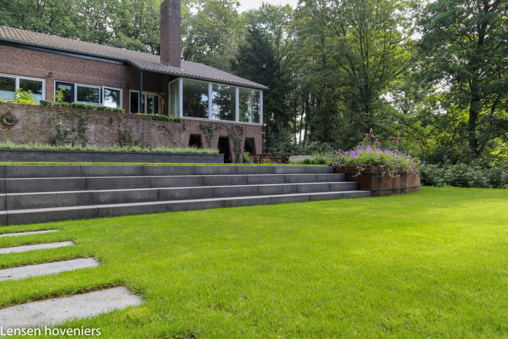 Tuinen in Arnhem geven vaak uitdagingen door de hoogteverschillen die we tegenkomen. Ook bij de tuinaanleg van deze tuin was er veel hoogteverschil zoals op de foto’s te zien is. Vanaf het boventerras dat al aanwezig was, kijk je prachtig op de benedentuin en het stuk bostuin. In het midden van de tuin is een grote brede trap gerealiseerd. Met de tuinaanleg zijn de hoveniers zes weken druk geweest, daarna hebben de tuineigenaren tuinmeubels en details aangebracht die veel sfeer geven.