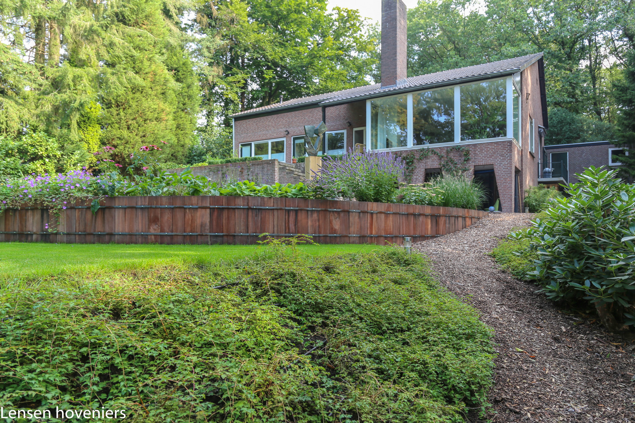 Een mooie grote achtertuin met zelfs een stuk bostuin in Arnhem. De tuineigenaren hebben een prachtige plek, maar hoe ze die tuin het beste konden inrichten dat was de vraag. Na overleg met Joost Lensen is er een tuinontwerp gemaakt. Het resultaat van de tuinaanleg van deze grote achtertuin in Arnhem is op de tuinfoto’s goed zichtbaar.