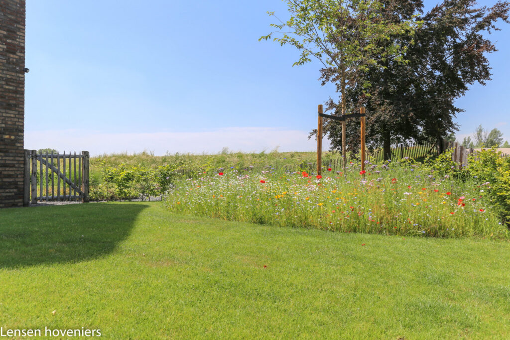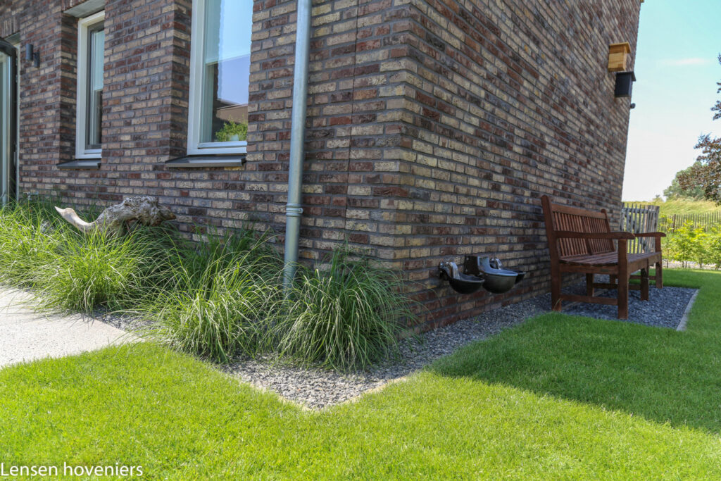 Op deze foto’s ziet u twee ruime terrassen, één bij het huis en één bij de overkapping aansluitend aan de schuur. Beide grenzen aan het gazon en geven een ander zicht op de tuin. In de plantenborders zijn mooie groepen beplanting aangeplant. In het gazon aan de zijkant zijn appelboompjes geplant, zo creëer je een kleine eigen boomgaard. Voor het huis zijn cirkels met siergrassen gerealiseerd met daaromheen grijs Ardennersplit. Heel leuk is ook de hoek met het bloemenmengsel, een fleurig geheel.