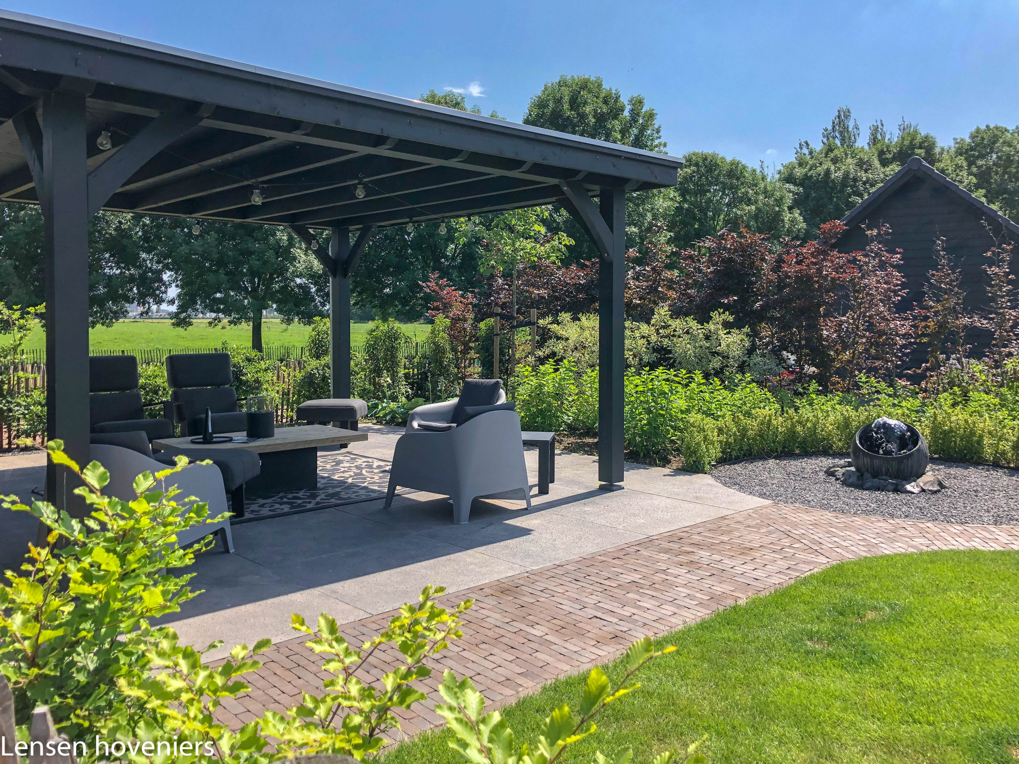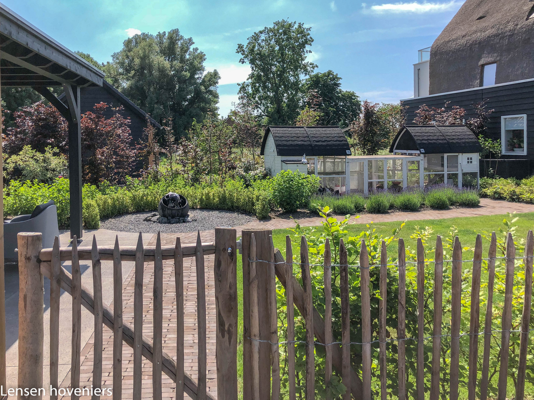 Rondom de tuin is een Engels hekwerk geplaatst, dit past perfect bij de landelijke stijl en uitstraling van de grote tuin. Wat verder opvalt is het mooie ruime kippenhok, de kippen hebben hier een heerlijk leven. Al met al een fijne tuin, waarbij er veel mogelijkheden zijn om te ontspannen en te genieten van het buitenleven. De overkapping is stijlvol ingericht en vergroot het tuingeluk.