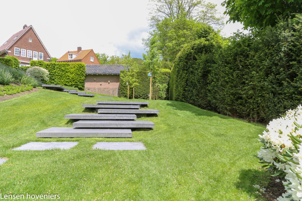 Een zwevende trap in een grote tuin dat ziet u op deze tuinfoto’s. Het is een tuin met erg veel hoogteverschil. Voordat de zwevende trap kon worden gerealiseerd moest er heel wat gebeuren.