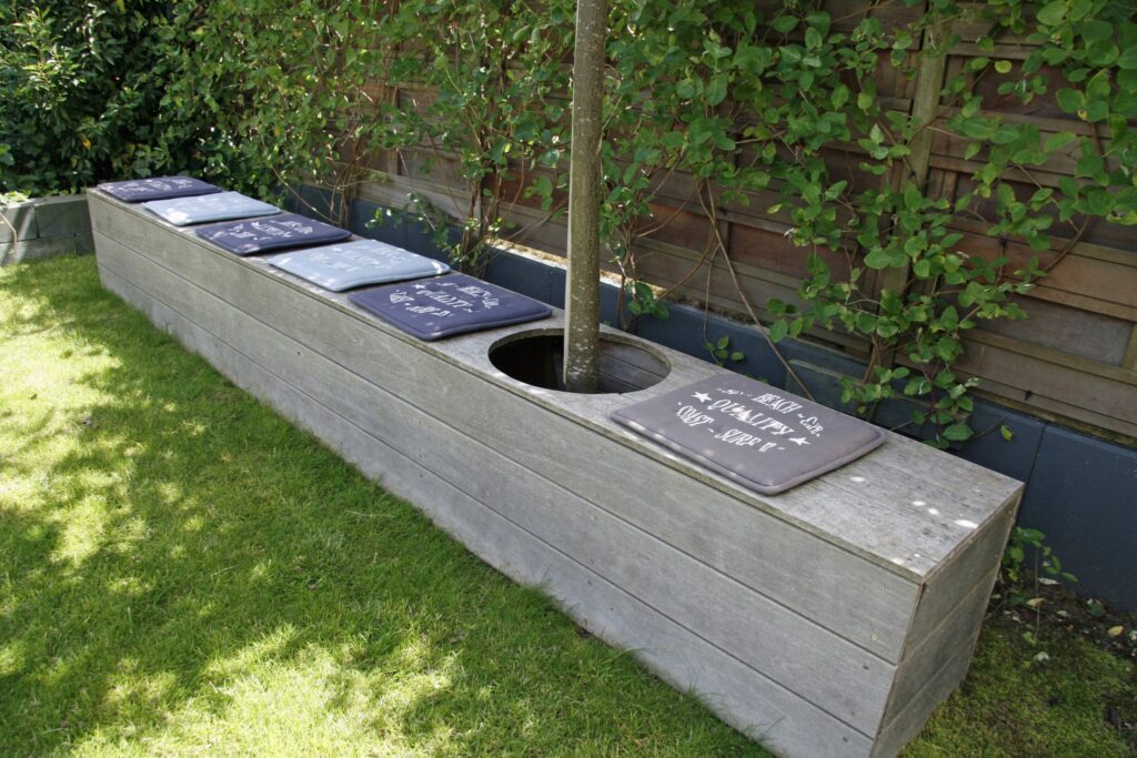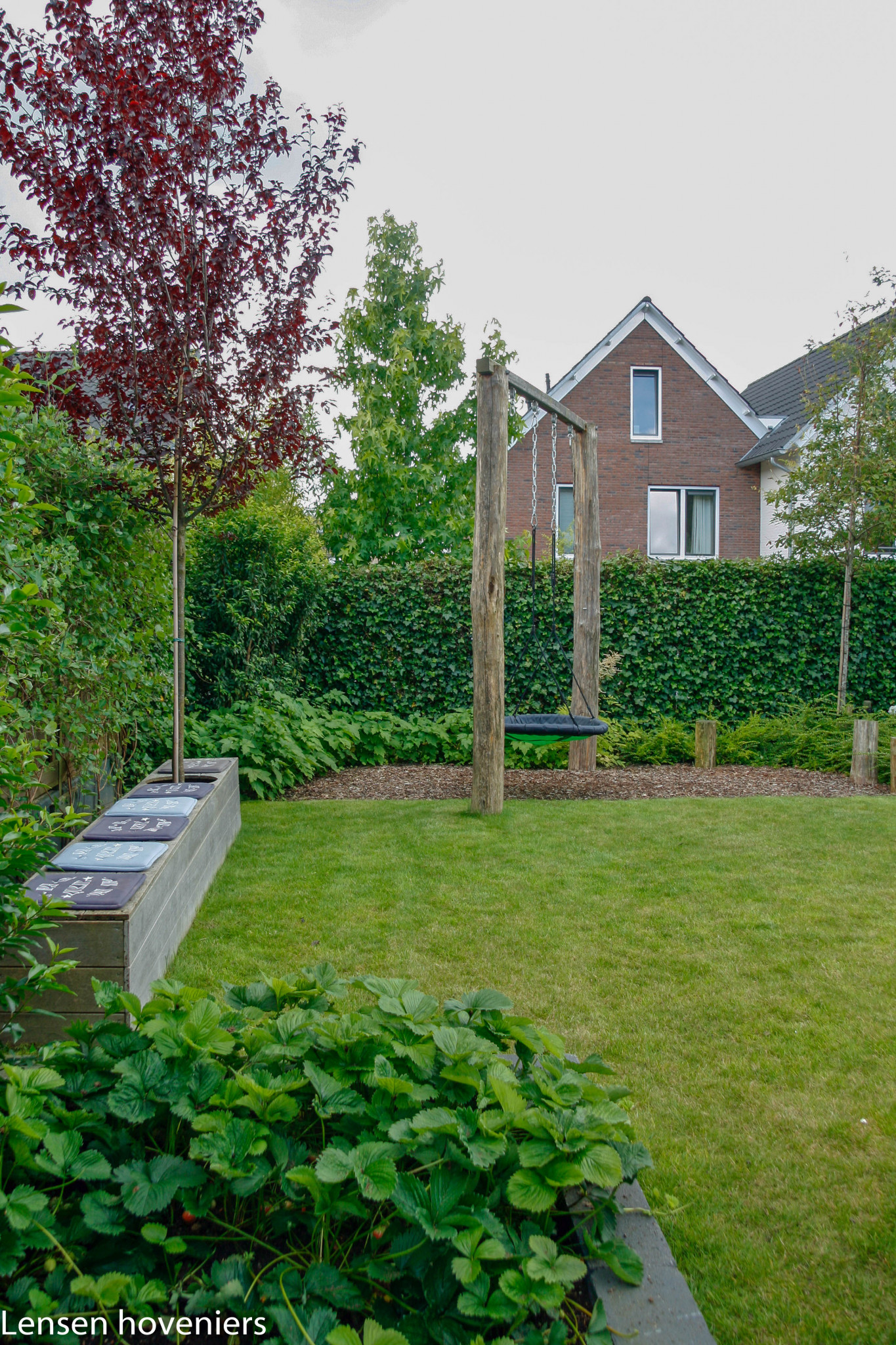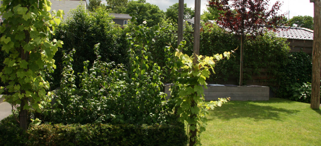 Een natuurlijke kindvriendelijke tuin kan ook prima bij een nieuwbouwhuis zoals u op de foto’s kunt zien. Vanuit het huis komen de bewoners op het terras met aansluitend een ruim speelgazon voor de kinderen. In de linkerhoek van de tuin is speelruimte voor de kinderen in het tuinontwerp opgenomen. De kastanjehouten palen versterken het natuurlijke effect. Aan de haken kunnen wisselend verschillende speelattributen worden gehangen. U ziet nu een grote schommel en een hangmat met daaronder boomschors. Heel leuk is ook de houtenbank met de boom erin, die op maat is gemaakt. De kinderen spelen en zitten veel op deze bank.