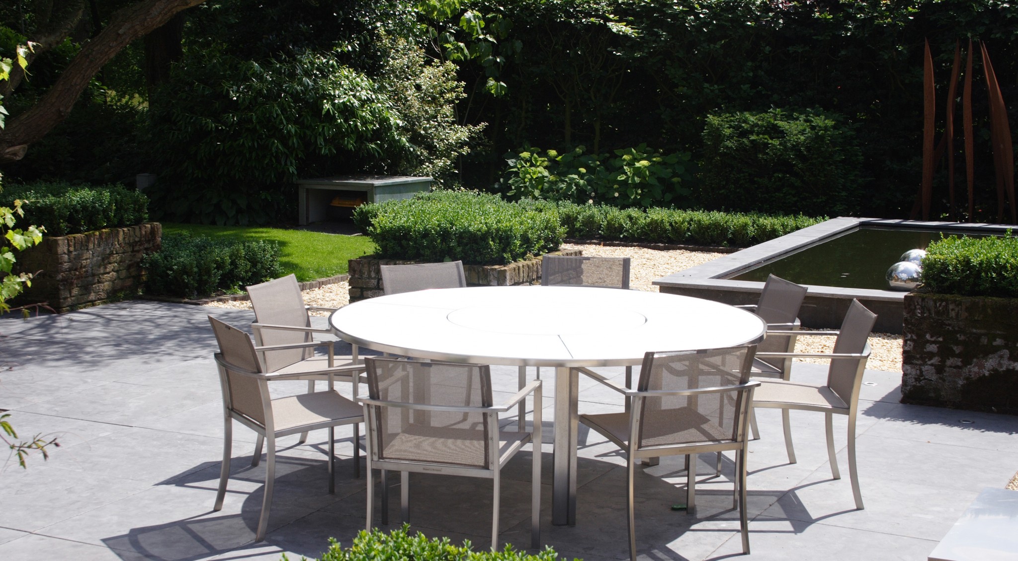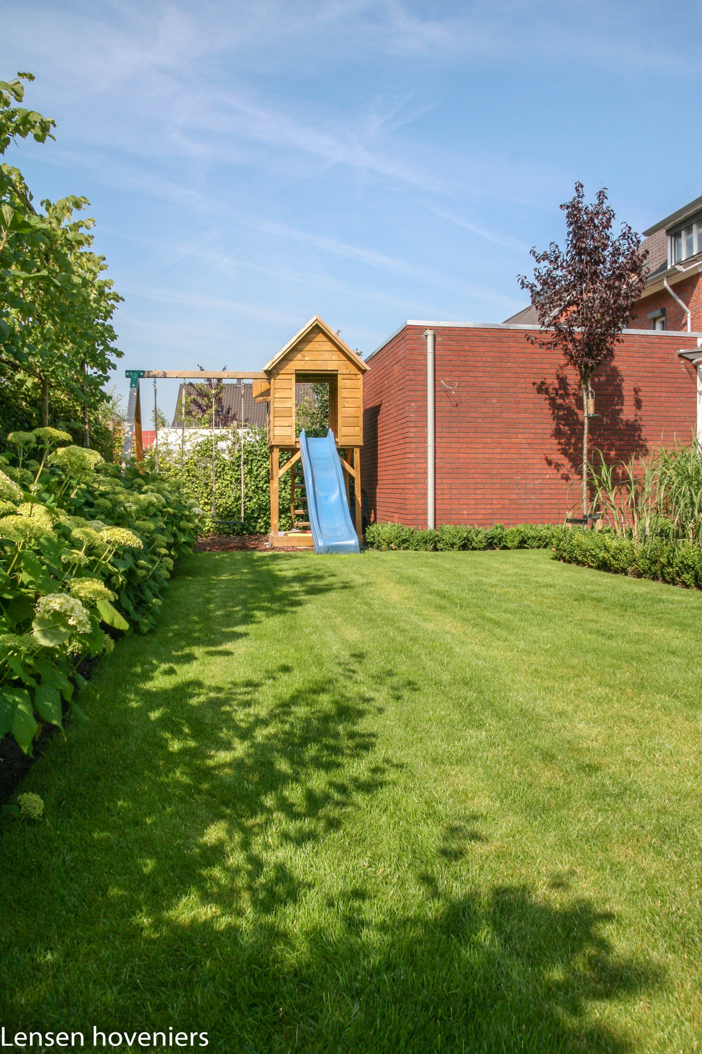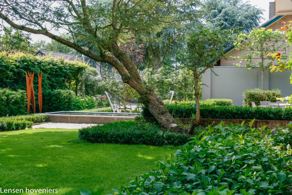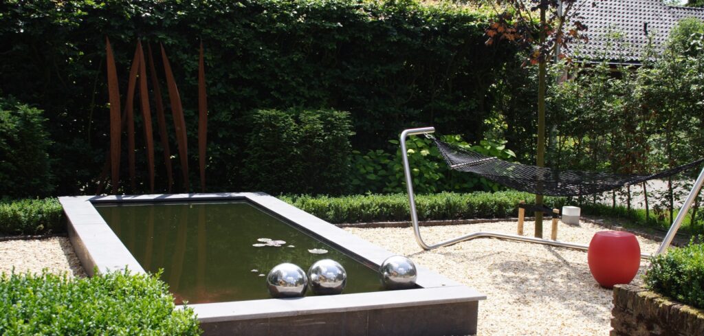 Vijvertuinen zijn er vele, maar welke vijvertuin past bij uw wensen? Bij dit huis gelegen in Gelderland is een vijvertuin aangelegd met moderne elementen. De wens van de bewoners was een strakke vijver. De rechte vijver heeft een vijverrand van Siam Bleustone. In de vijver zitten zuurstofplanten en een waterlelie. Leuk detail zijn de zilverkleurige bollen die in het water drijven. Er zijn verschillende kunstobjecten in de tuin geplaatst.