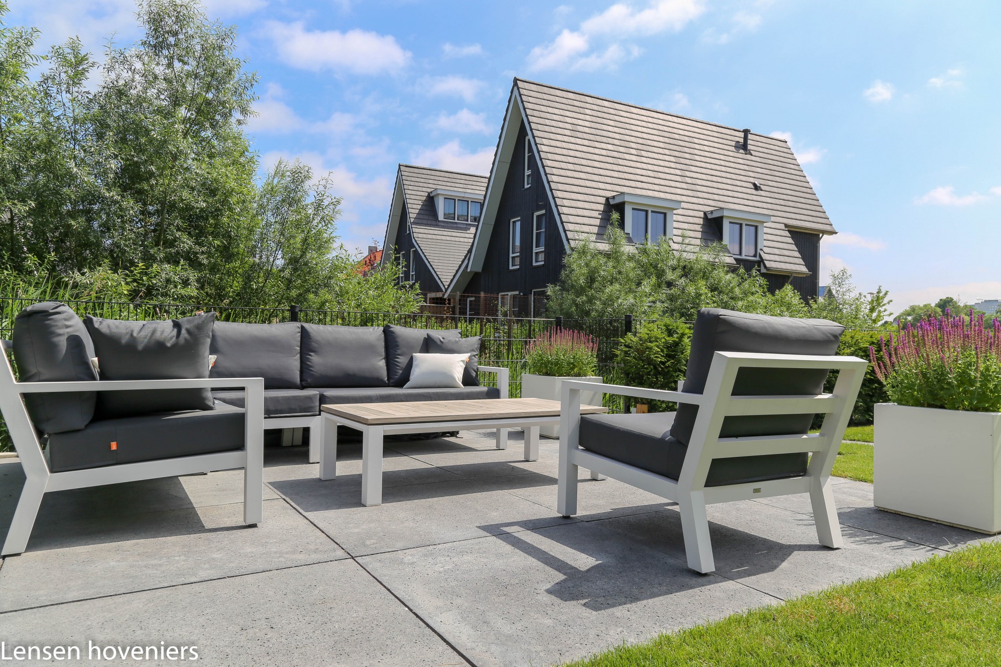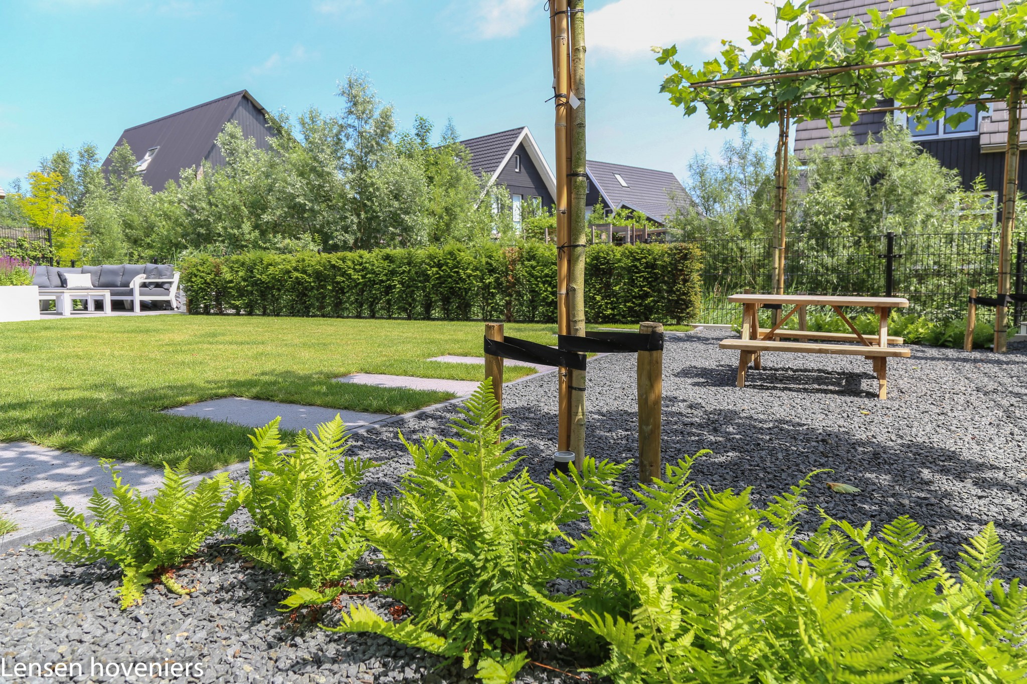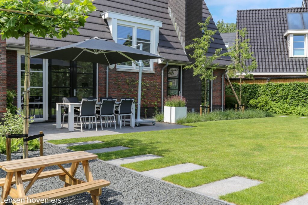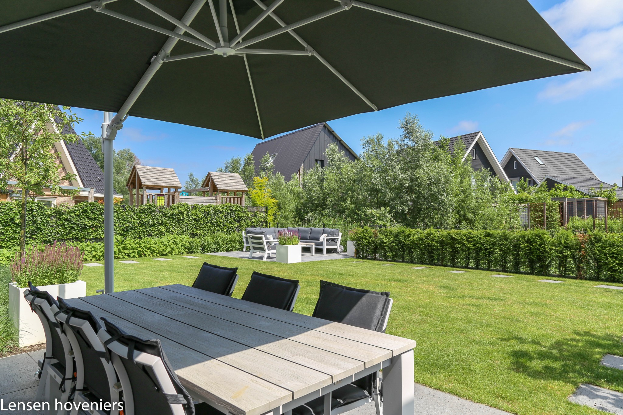 U ziet een moderne strakke tuin met een ruim gazon en twee terrassen. Omdat de bewoners twee kleine kinderen hebben, is er voor de veiligheid, een afscheiding geplaatst tussen het achterliggende water en de tuin. Er is veel groenblijvende beplanting aangeplant, dit geeft de tuin een rustige en moderne uitstraling. Op het moment dat de foto’s zijn gemaakt is de tuin nog jong. De dakplatanen moeten nog groeien, maar deze gaan voor een mooie natuurlijke schaduwplek zorgen, waar de kinderen heerlijk kunnen spelen. Leuk detail is de schommel die aan de zijkant van het huis is geplaatst. De uitgekozen meubels geven de tuin de juiste finishing touch. Wilt u een andere tuin bij nieuwbouw bekijken, klik hier. Bent u op zoek naar tuininspiratie? Bezoekt u dan eens de Tuinen van Appeltern: Klik hier voor meer informatie