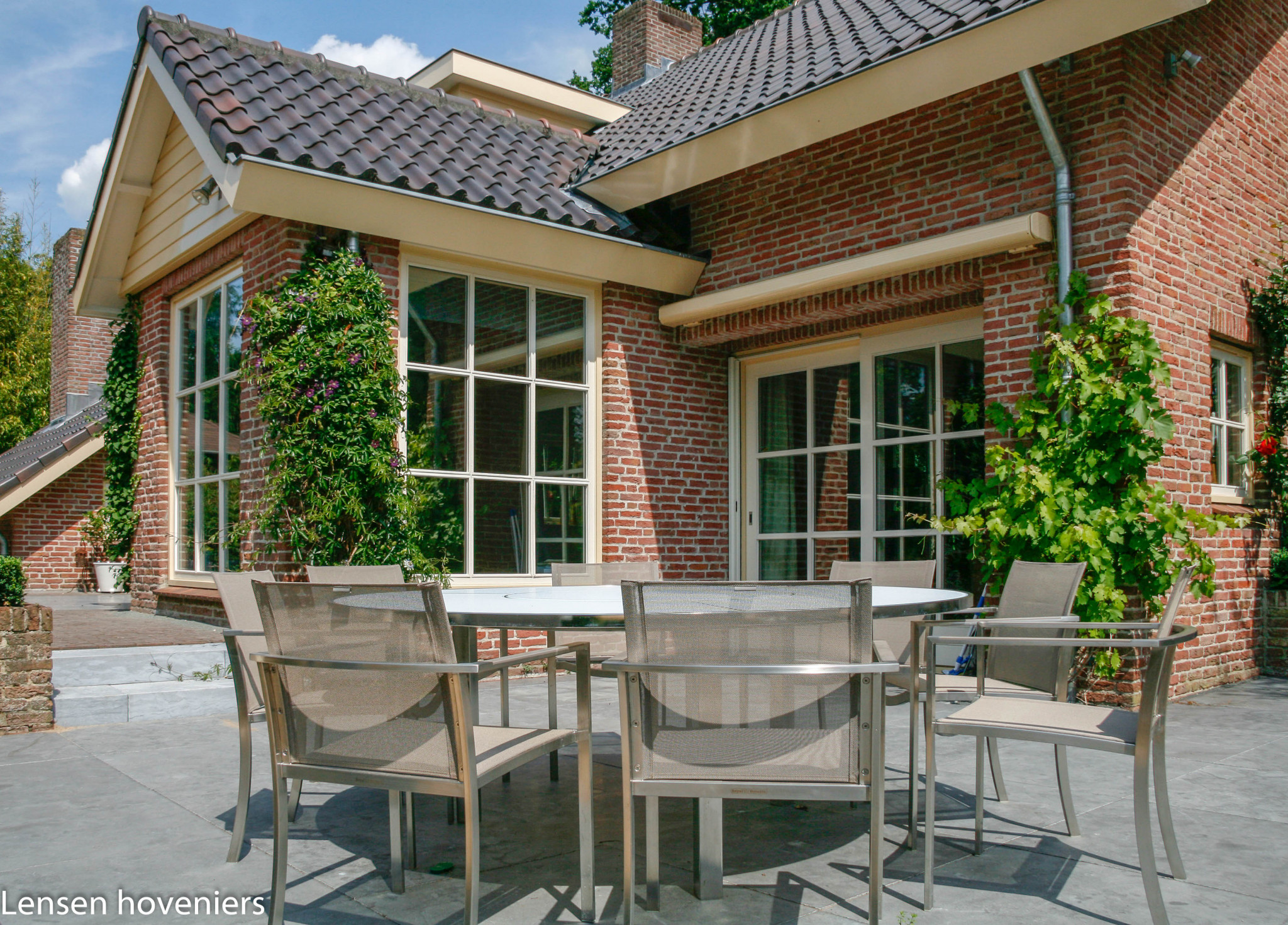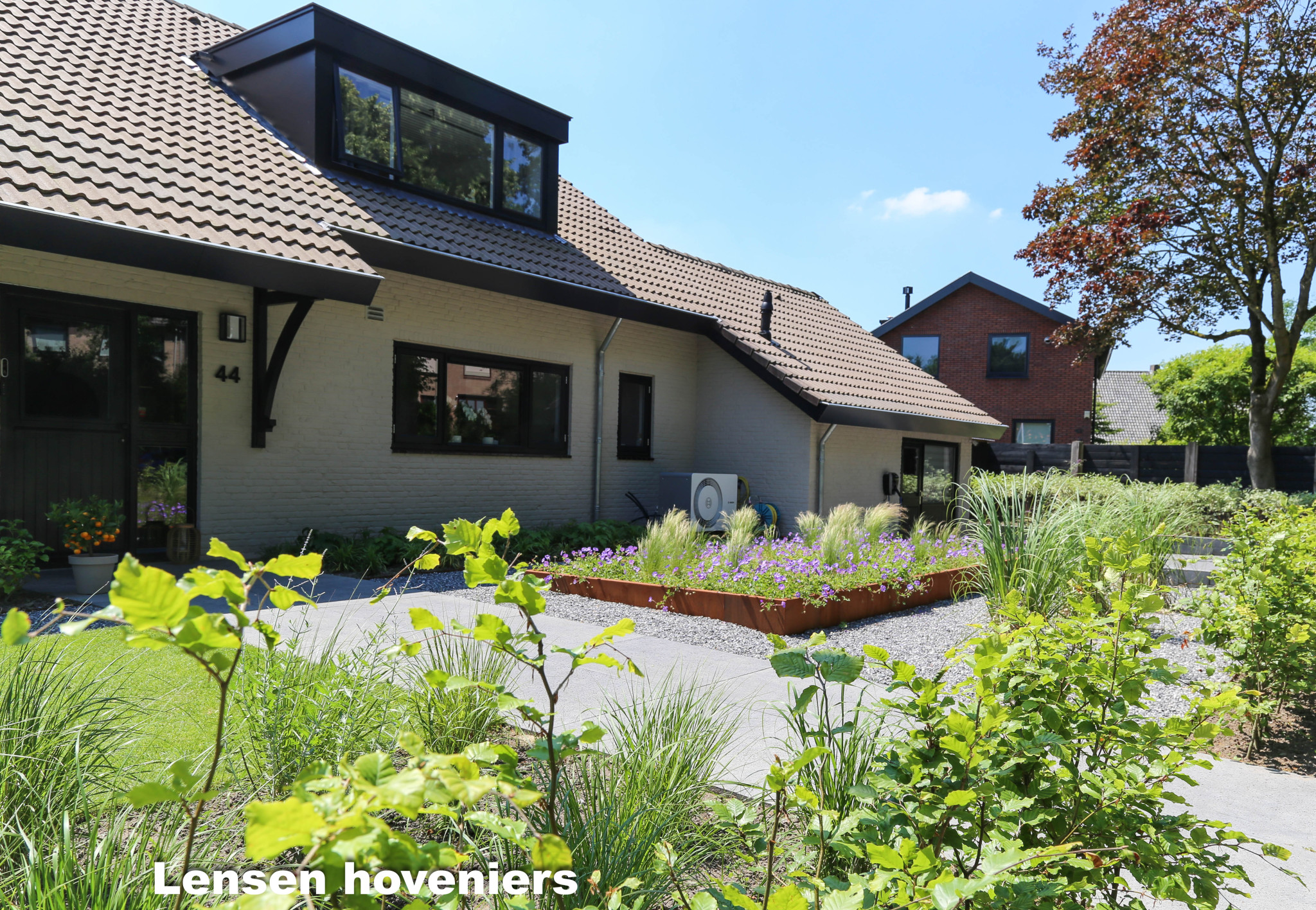 U ziet tuinfoto’s van een moderne tuin in Driel. Het tuinontwerp en de tuinaanleg zijn gerealiseerd door Lensen hoveniers. Bij de tuinaanleg in Driel bestaat de bestrating uit een combinatie van 100×100 cm betontegels en gebakken, getrommelde waalformaat klinkers. Voor de halfverharding is gebruik gemaakt van grijs Ardennersplit. In de voortuin is de grote Cortenstalen plantenbak met beplanting echt een blikvanger. De Cortenstalenbak geeft de voortuin een robuuste en moderne uitstraling.