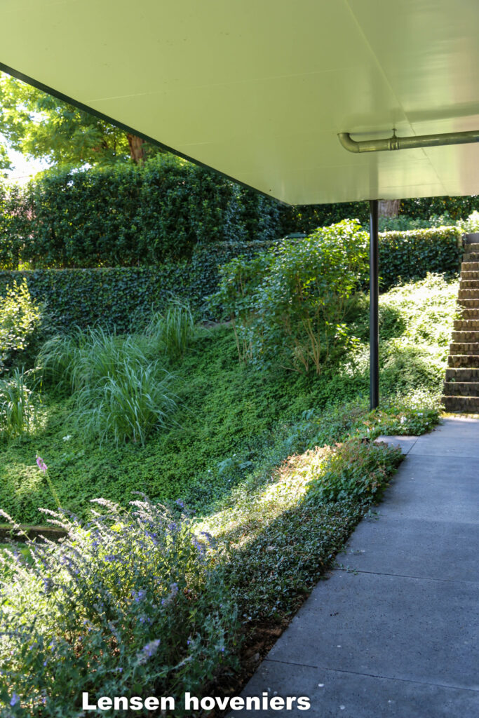 In de achtertuin ziet u een mooie ruime overkapping, ideaal om te ontspannen en te genieten van de tuin. Rondom het huis ligt een gazon met daarnaast een ruime plantenborder gevuld met verschillende soorten vaste planten en siergrassen. ’s Avonds worden de bomen sfeervol verlicht door spotjes van Inlite, wat een warme en gezellige sfeer creëert in de tuin.