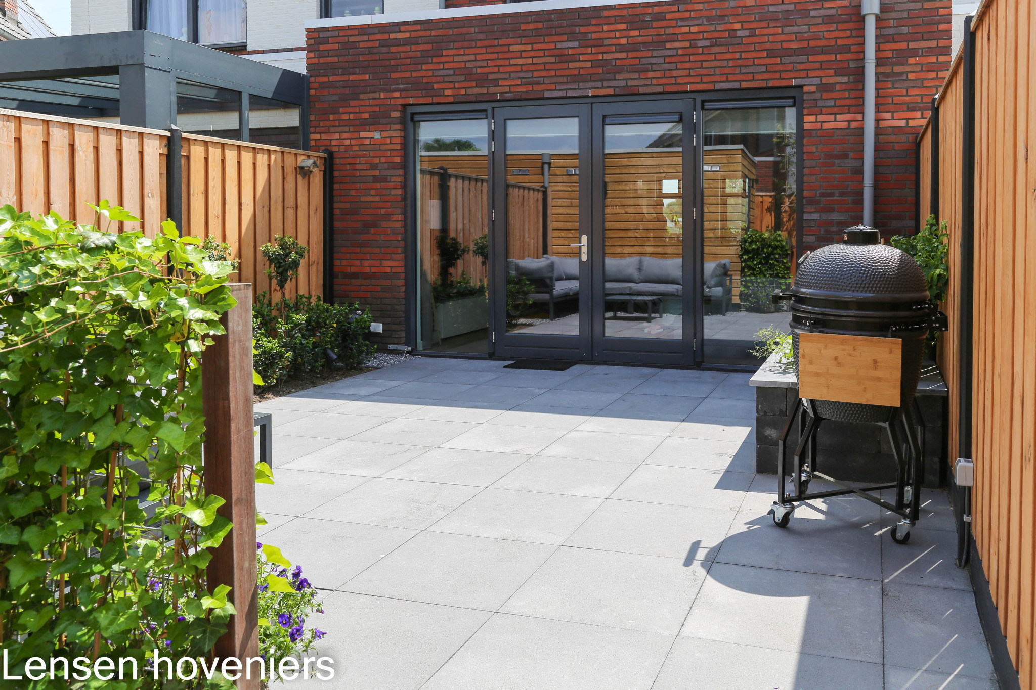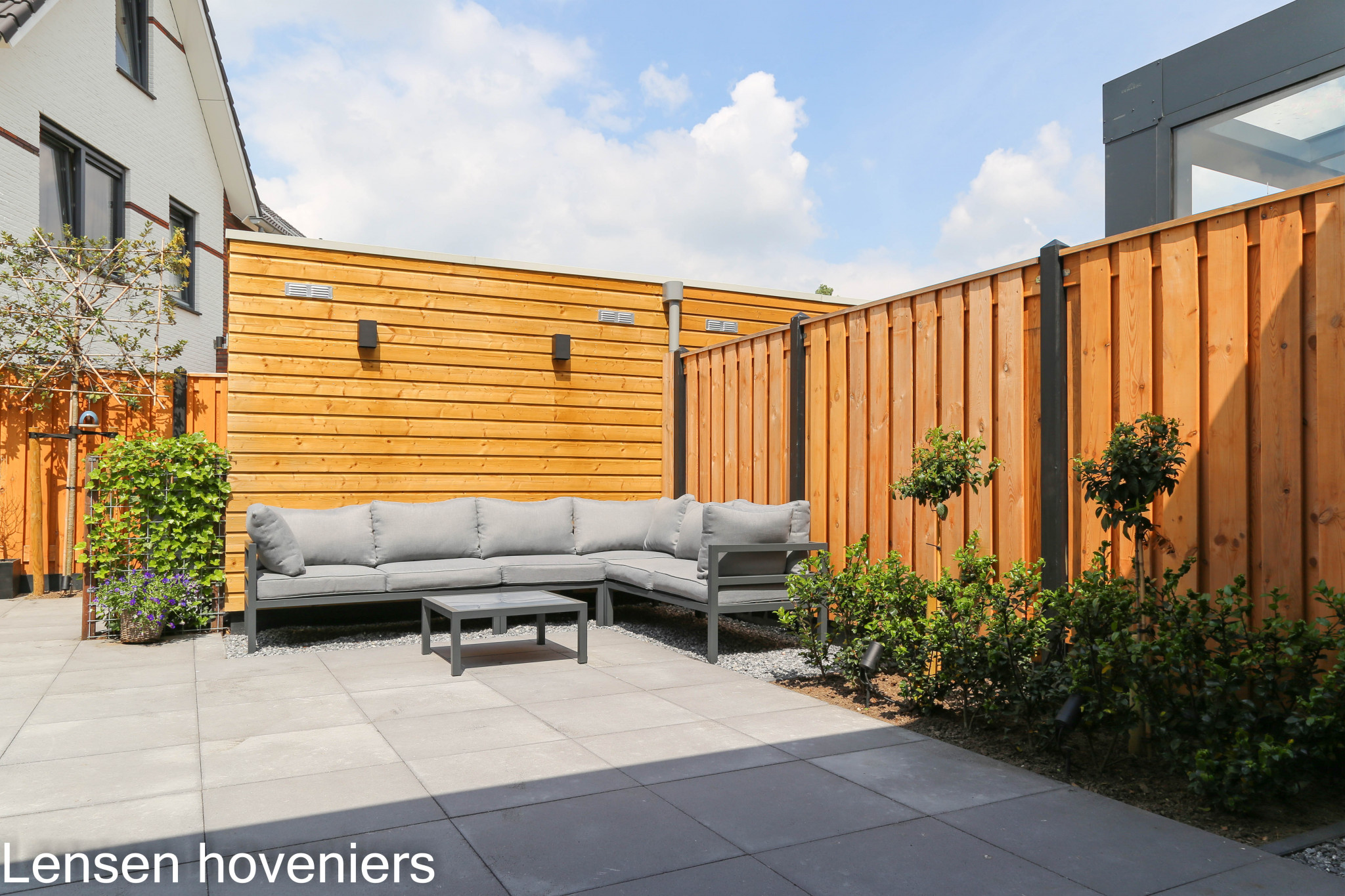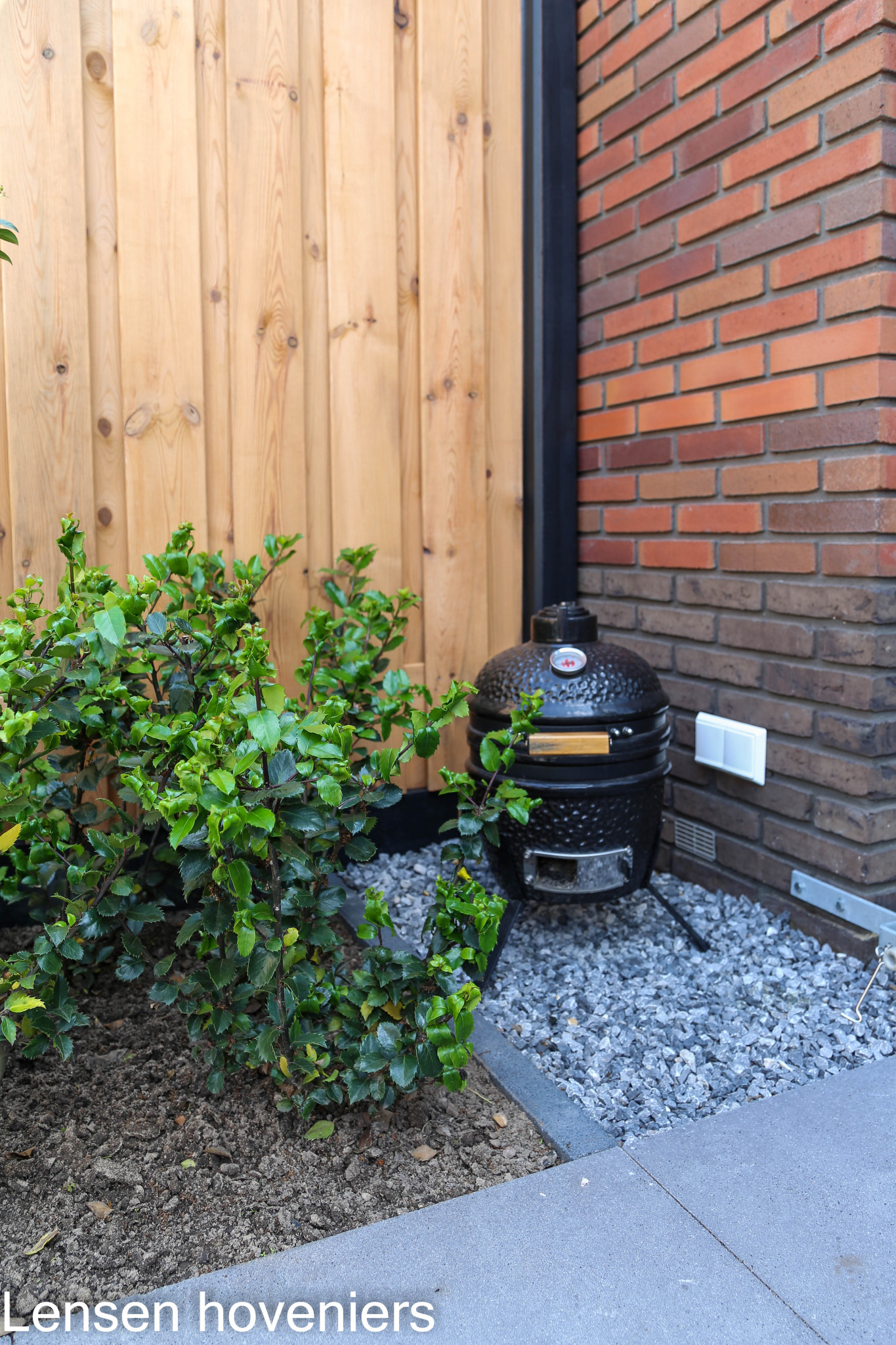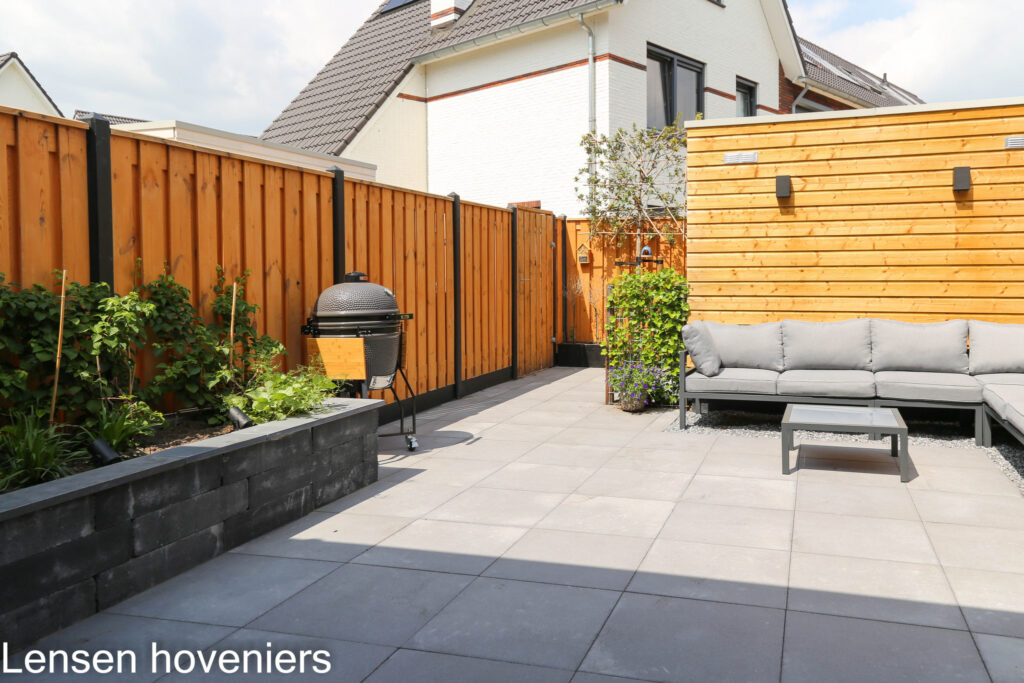 Een tuin bezitten is echt fijn! De tuin hoeft echt niet heel groot te zijn. Op de foto’s ziet u het resultaat van tuinaanleg van een kleine achtertuin in Huissen. De tuin is praktisch en vanuit de woonkamer goed zichtbaar, schuifpui open en lekker genieten. De loungebank is tegen de schuur aan geplaatst zodat de tuin ook ruimtelijk blijft. Naast de poort is een Quercus Ilex geplant, deze moet nog groeien maar geeft groen aan de tuin. Het gaaswerk met klimop neemt het zicht op de containers weg. Zoals u ziet is er aan beide zijden van het terras groenblijvende beplanting aangeplant. Alle beplanting is nog jong maar deze aanplant geeft nu al sfeer. Beplanting is altijd belangrijk in een tuin zo ook bij de tuinaanleg in Huissen.