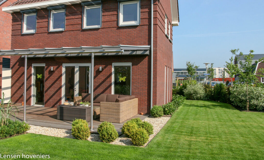Elke stadstuin heeft zijn eigen charme, deze stadstuin is lang en smal. Achter de tuin zijn nieuwbouwhuizen gerealiseerd. Een goede erfafscheiding is daarom wenselijk. Het plaatsen van een tuinoverkapping gaf uitkomst. Er naast een stukje schutting en groene beplanting waardoor er minder zicht is op de huizen erachter. Als de bewoners gezellig onder de tuinoverkapping zitten kijk je ook heel anders naar je eigen huis en heb je een ander zicht op de tuin.