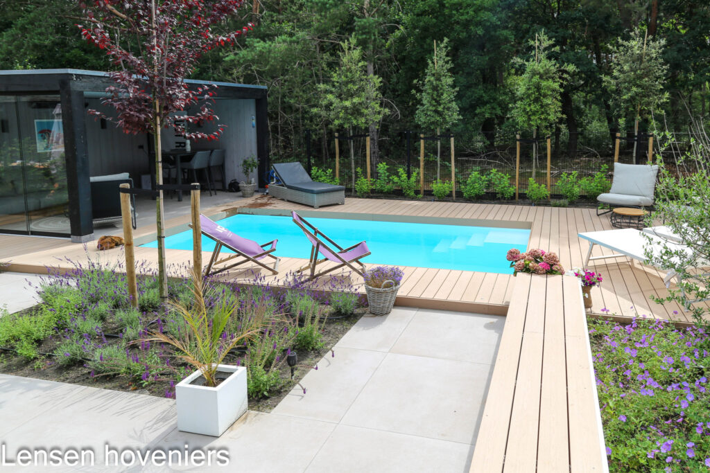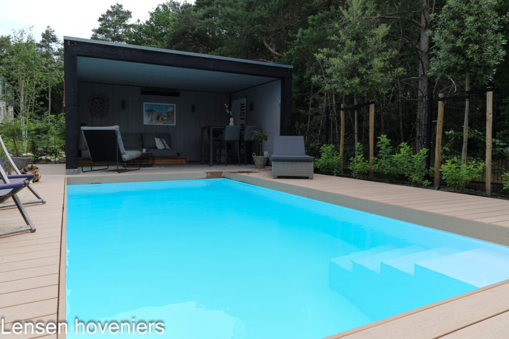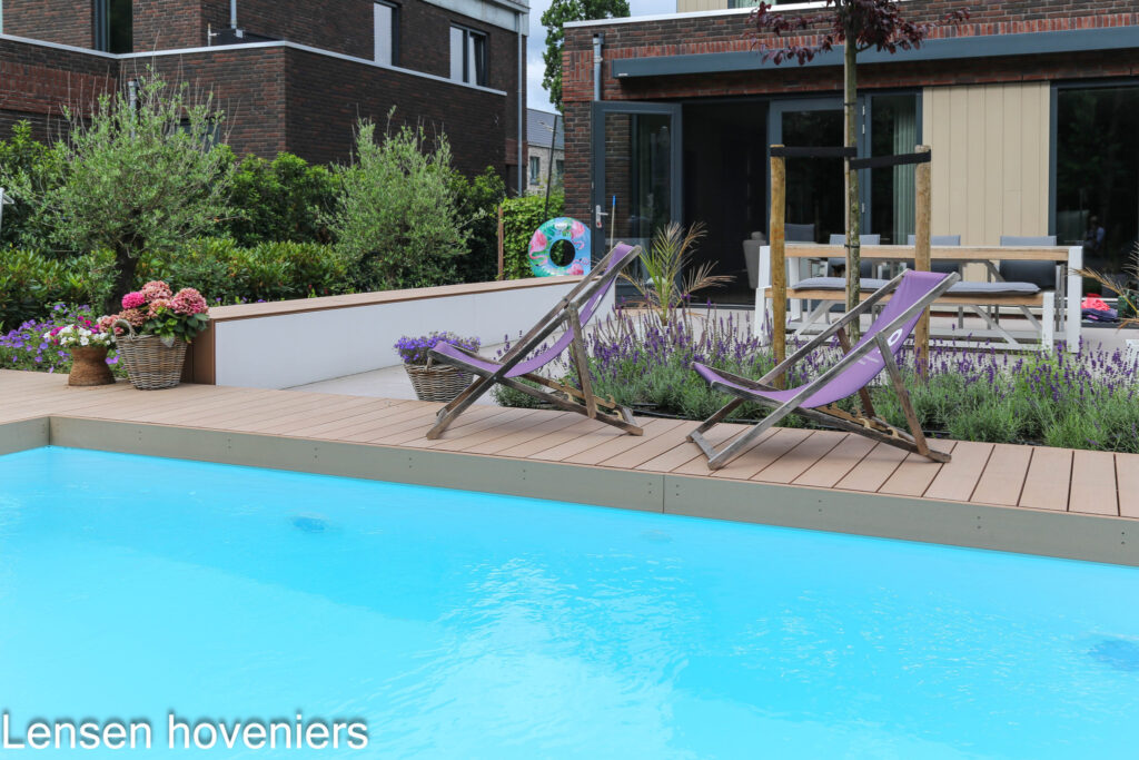 Je ziet een zwembadtuin in Ede. Het tuinontwerp en de tuinaanleg bij dit nieuwbouwhuis is door Lensen hoveniers in 2022 gerealiseerd. Rondom het zwembad in de achtertuin is een vlonder van composiet aangelegd. Heel mooi is de witte lange bank met daarop dezelfde composiet vlonder planken. Aansluitend, een ruim terras van 100 x 100 keramische tegels. Op het terras is een eettafel geplaatst die weer heel mooi bij de lange bank past.